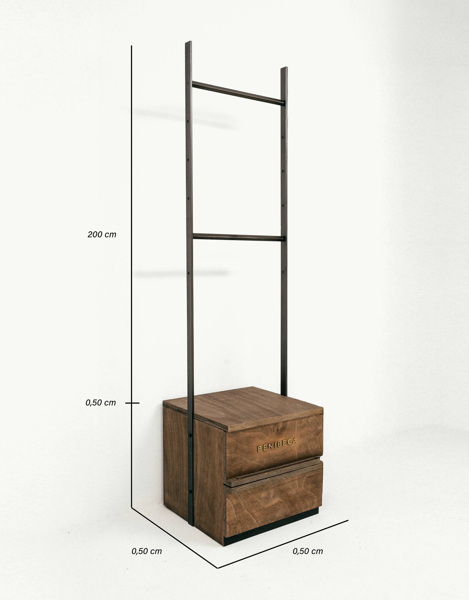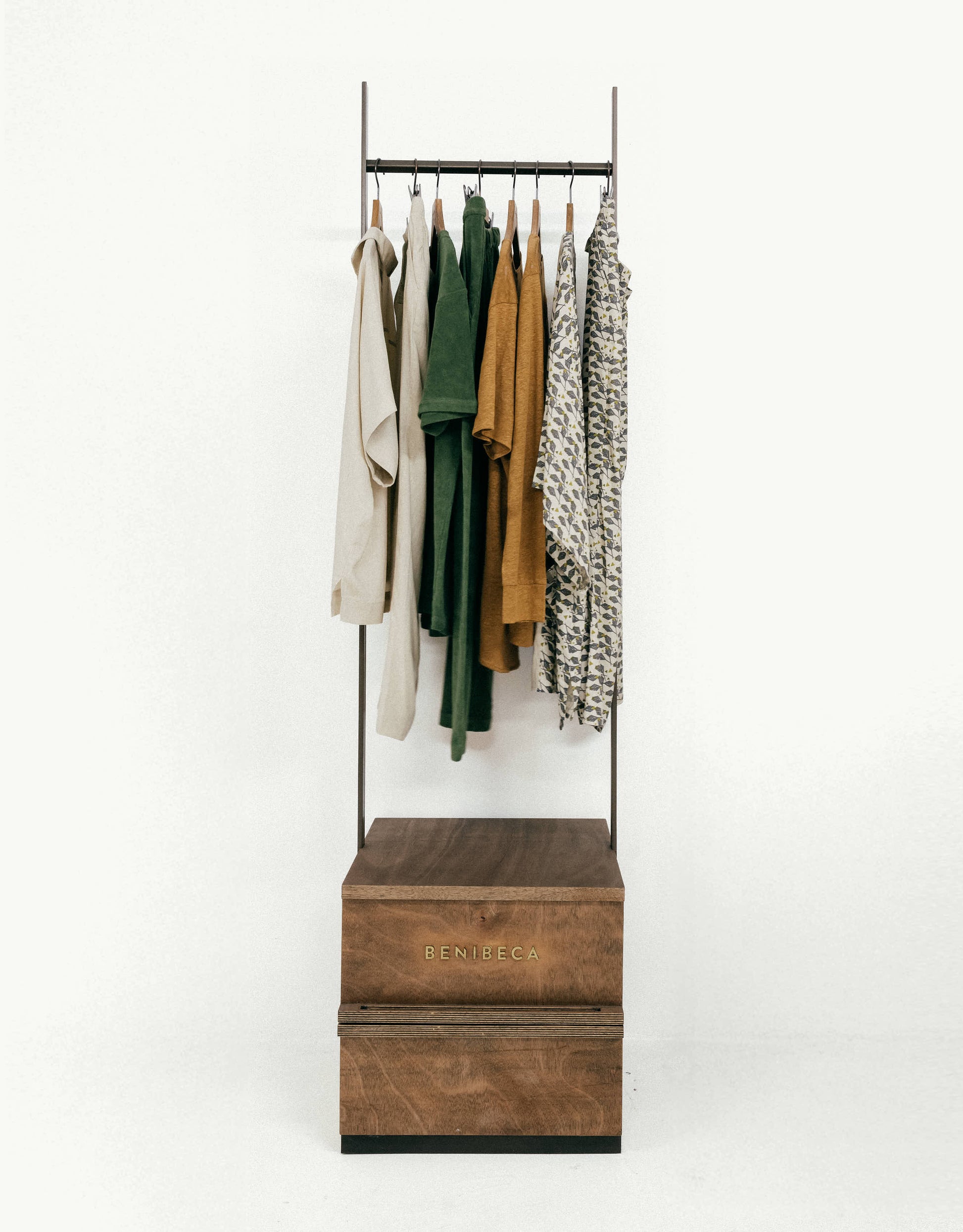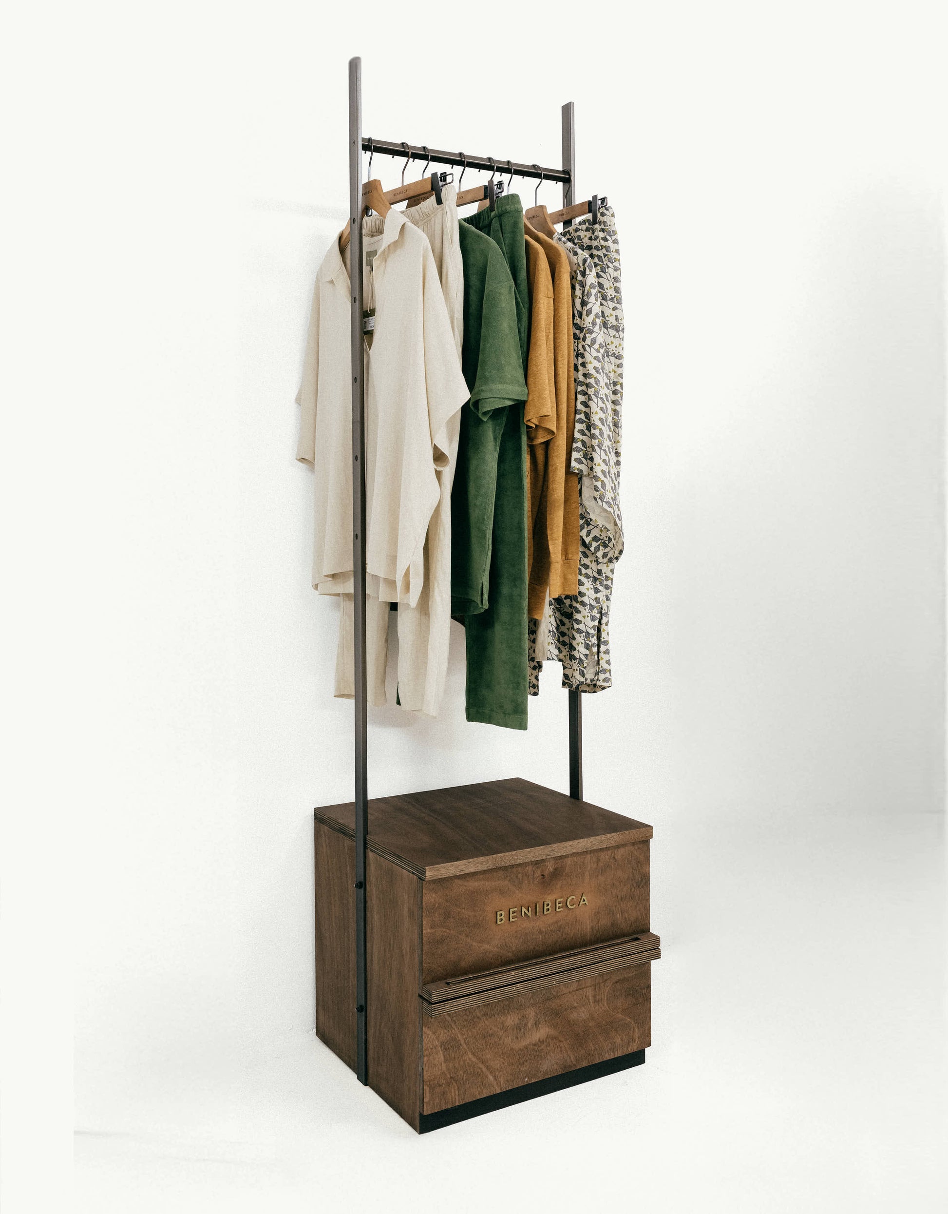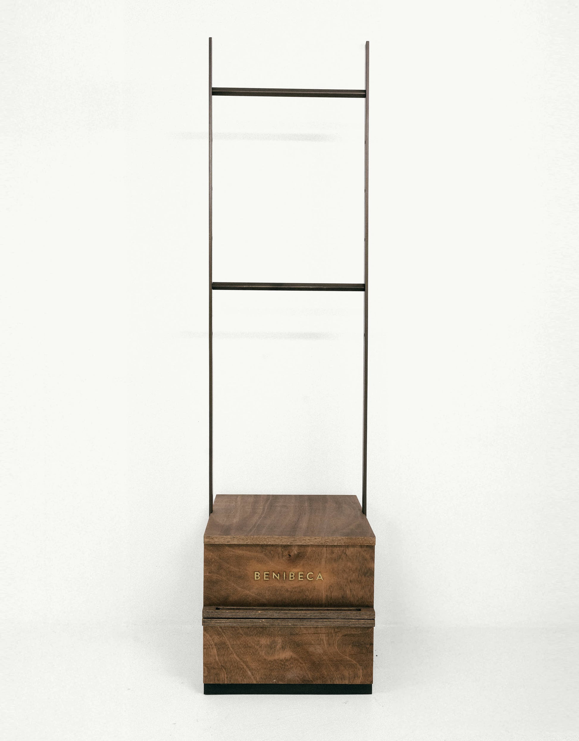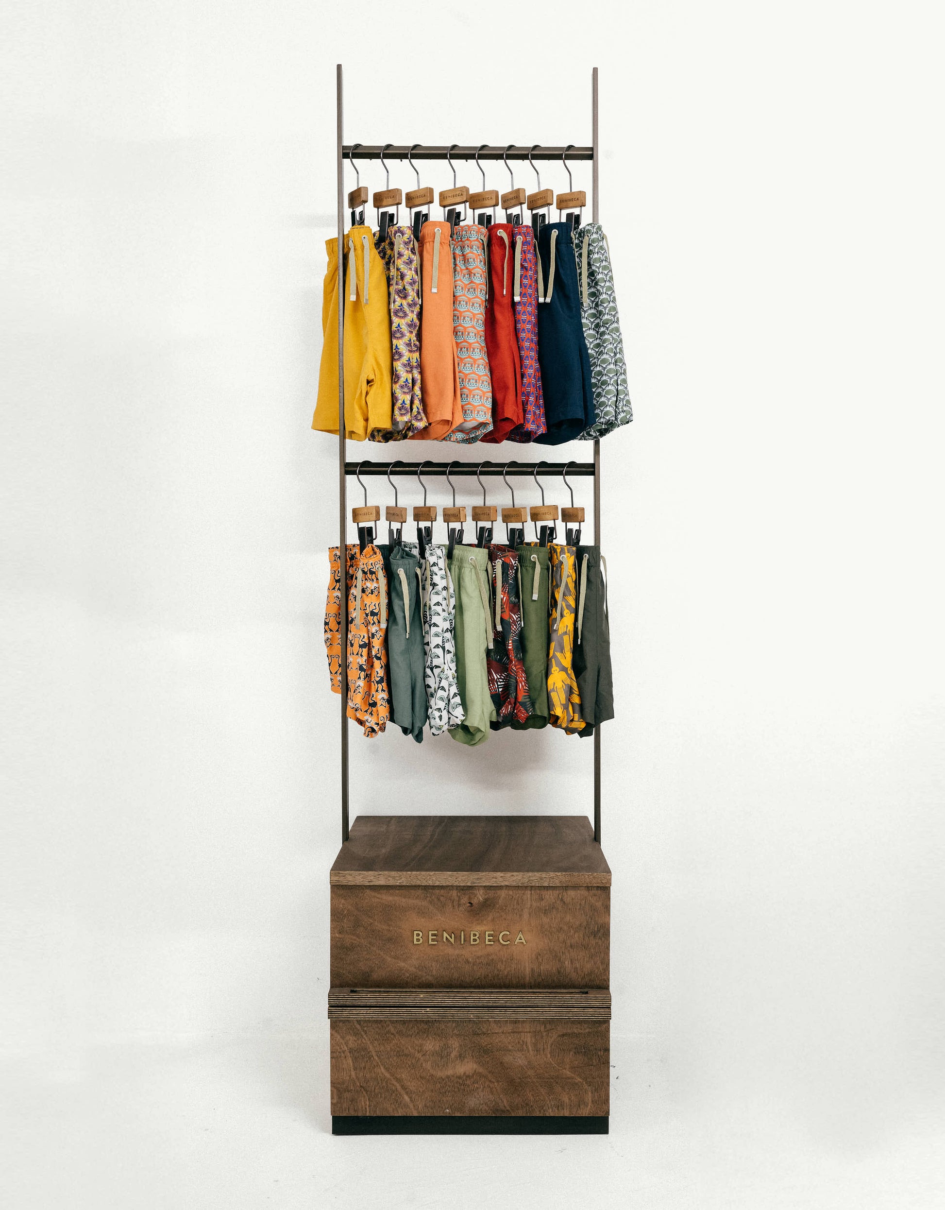 Each unit can include one or two hanging bars — one bar to present shirts, kaftans, or other garments from the Benibeca collection, or two bars to optimize space for displaying multiple swimwear pieces.