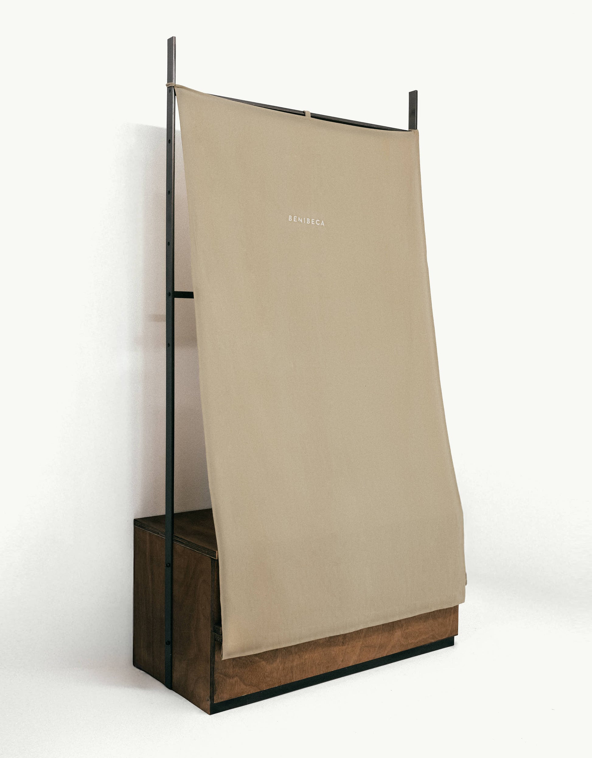 Crafted from 100% cotton in Benibeca’s signature color, this protective cover is tailored to fit our display units perfectly. Ideal for trade fairs, pop-up stores, and open retail spaces, it shields both garments and furniture from dust, light exposure, and unwanted attention when the store is closed.