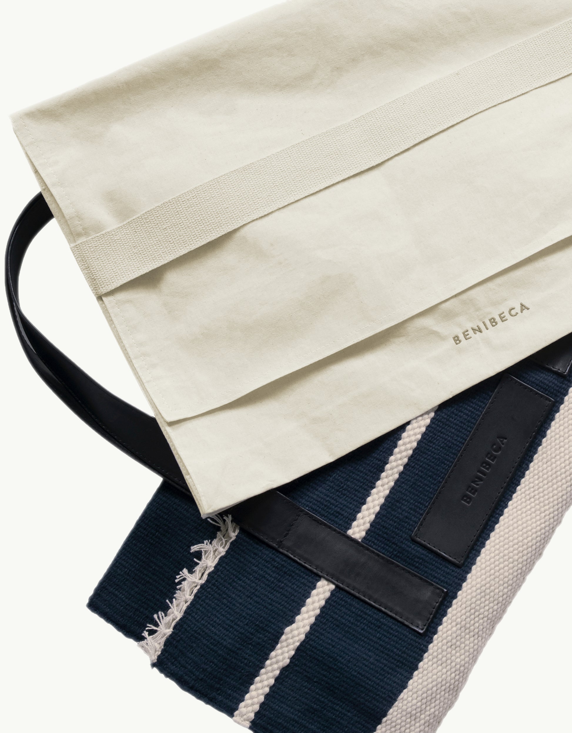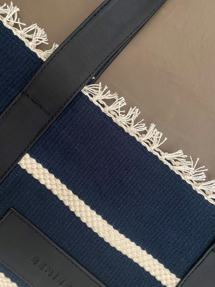 The bag preserves the original finish of the warp, which changes from a functional perspective (support for the weft) to a design argument. The knots prove that this fabric has been crafted by the hand of the craftsman from start to finish. It is our particular vision of craftsmanship that acquires a new and exclusive artistic dimension.