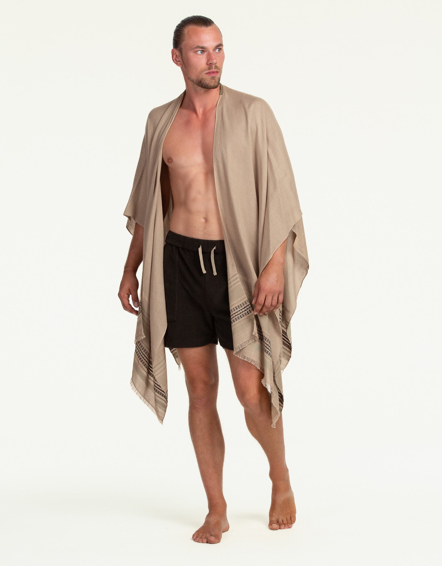 The most exquisite boho sophistication takes shape in this ruana handcrafted by artisans from the town of Hualhuas. This garment captures that je ne sais quoi of those who take elegance to the next level. The piece hugs the body with sublime lightness and softness, thanks to the high quality of the Pima yarn. A new symbol of summer luxury designed with versatility in mind, to dress with natural sophistication for beach getaways or evenings at the seasonal place to be.