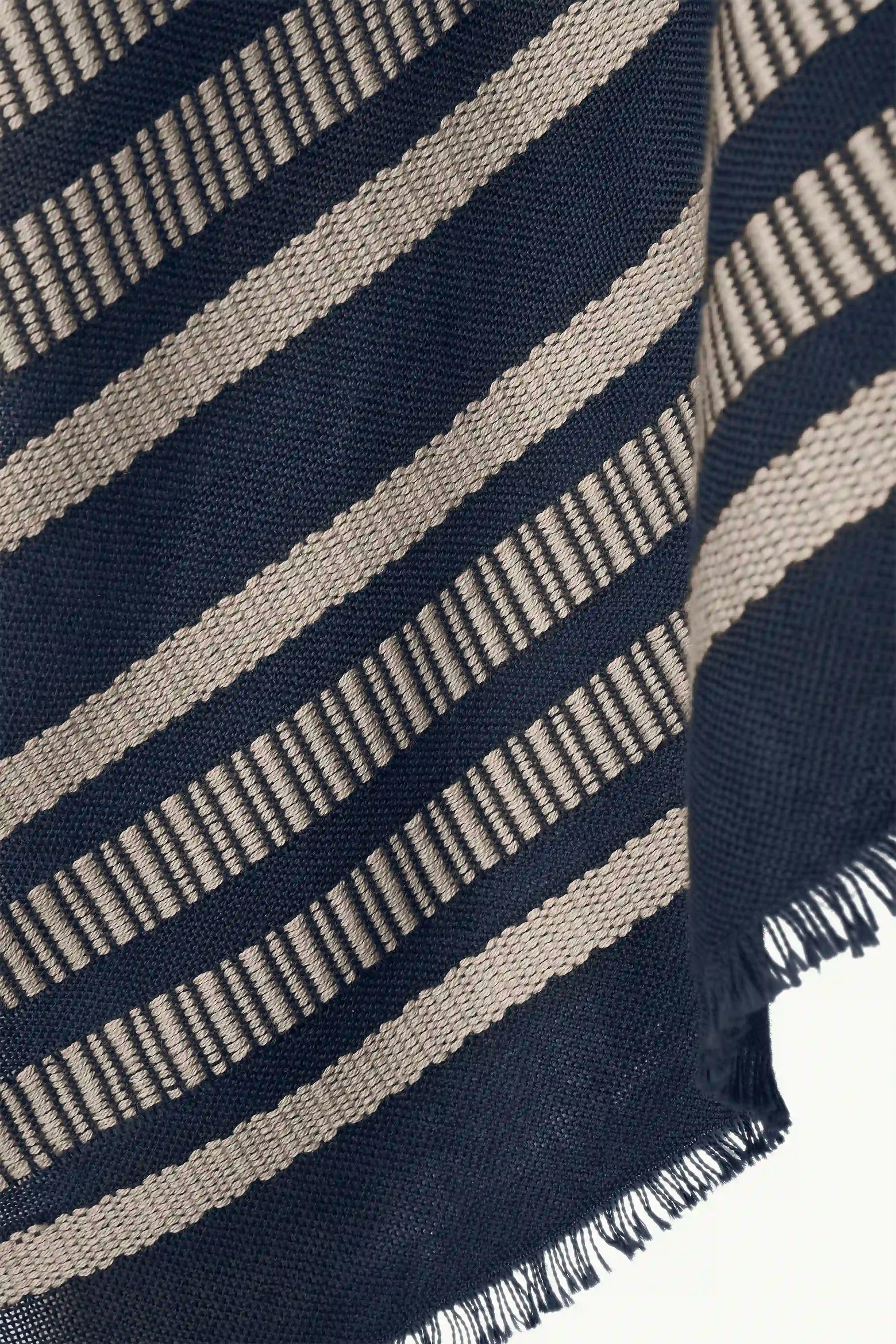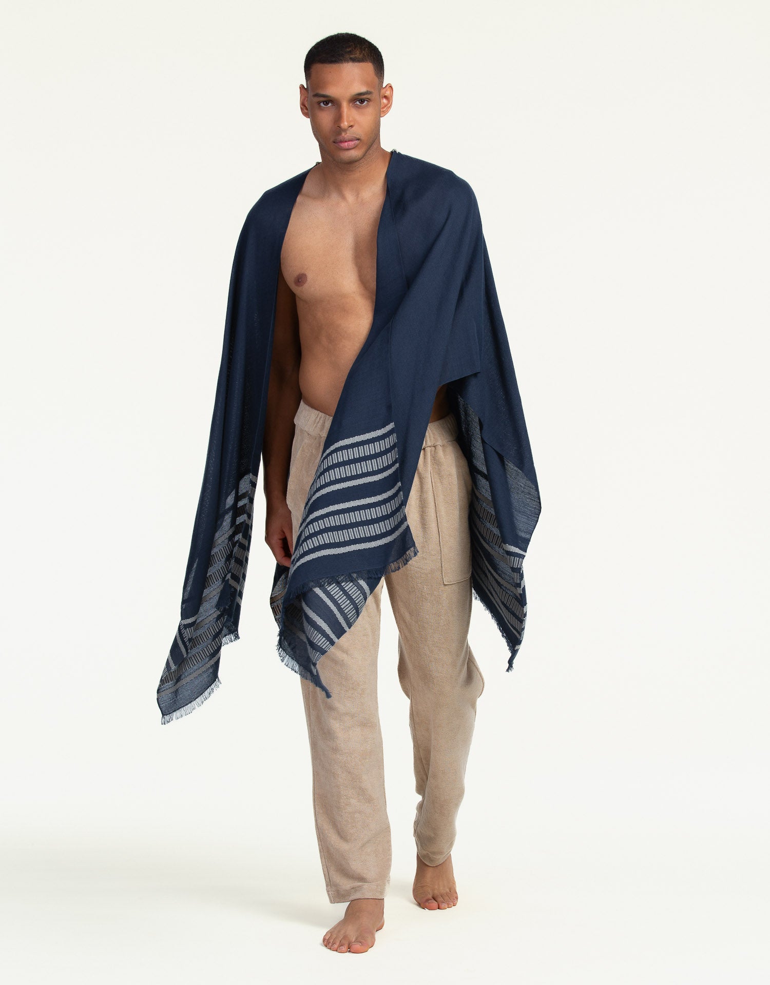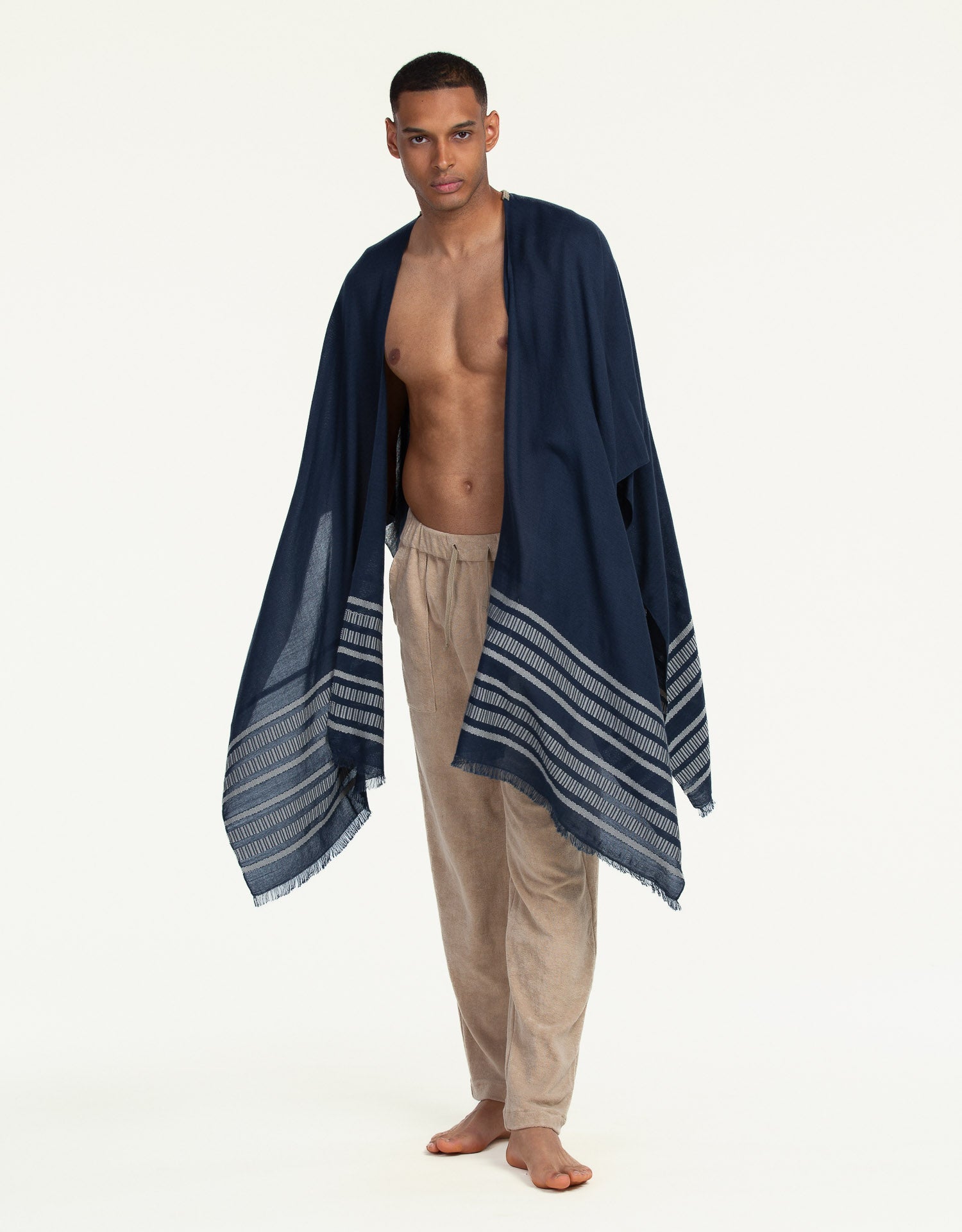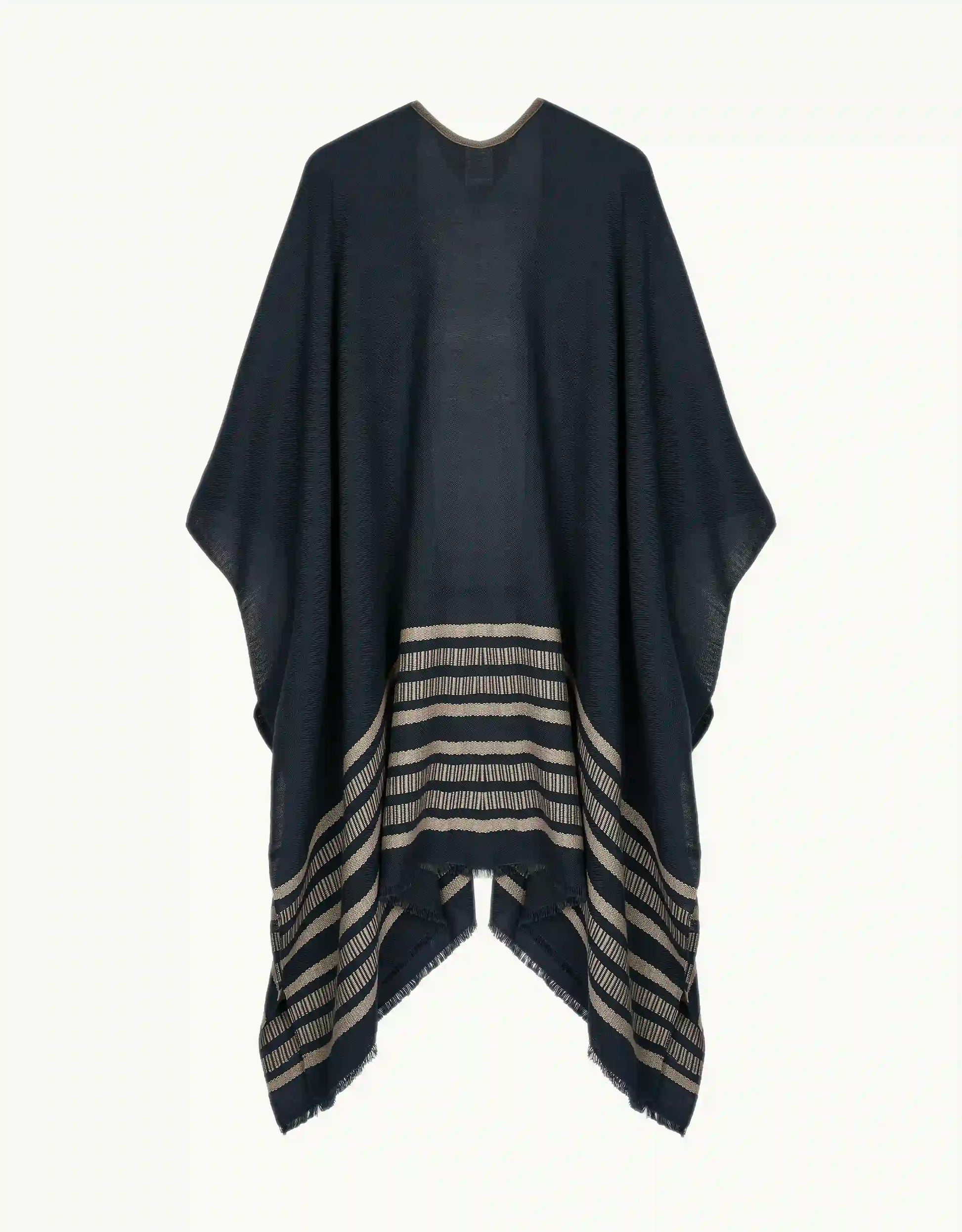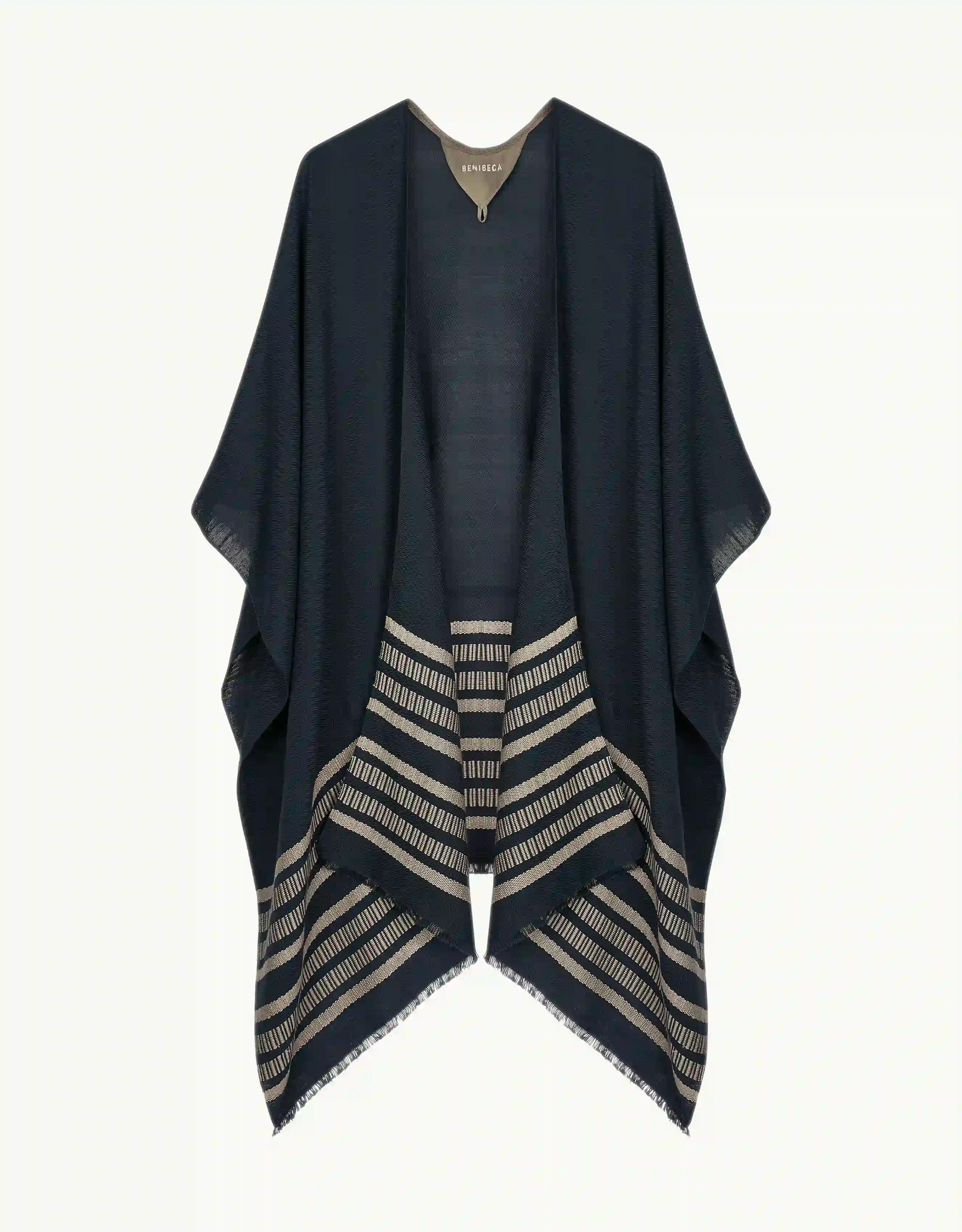 Draped in the fluid lines of the Jauja Ruana, you'll find an accessory that's both a statement and a whisper. The delicate Pima yarn offers a caress of softness in a serene beige, accented with bold black patterns—a feather-light embrace that speaks to those who wear their elegance with a sense of ease. This piece moves with you from the calm of a beachside retreat to the buzz of an exclusive soirée, holding the essence of Benibeca's luxurious but laid-back spirit.