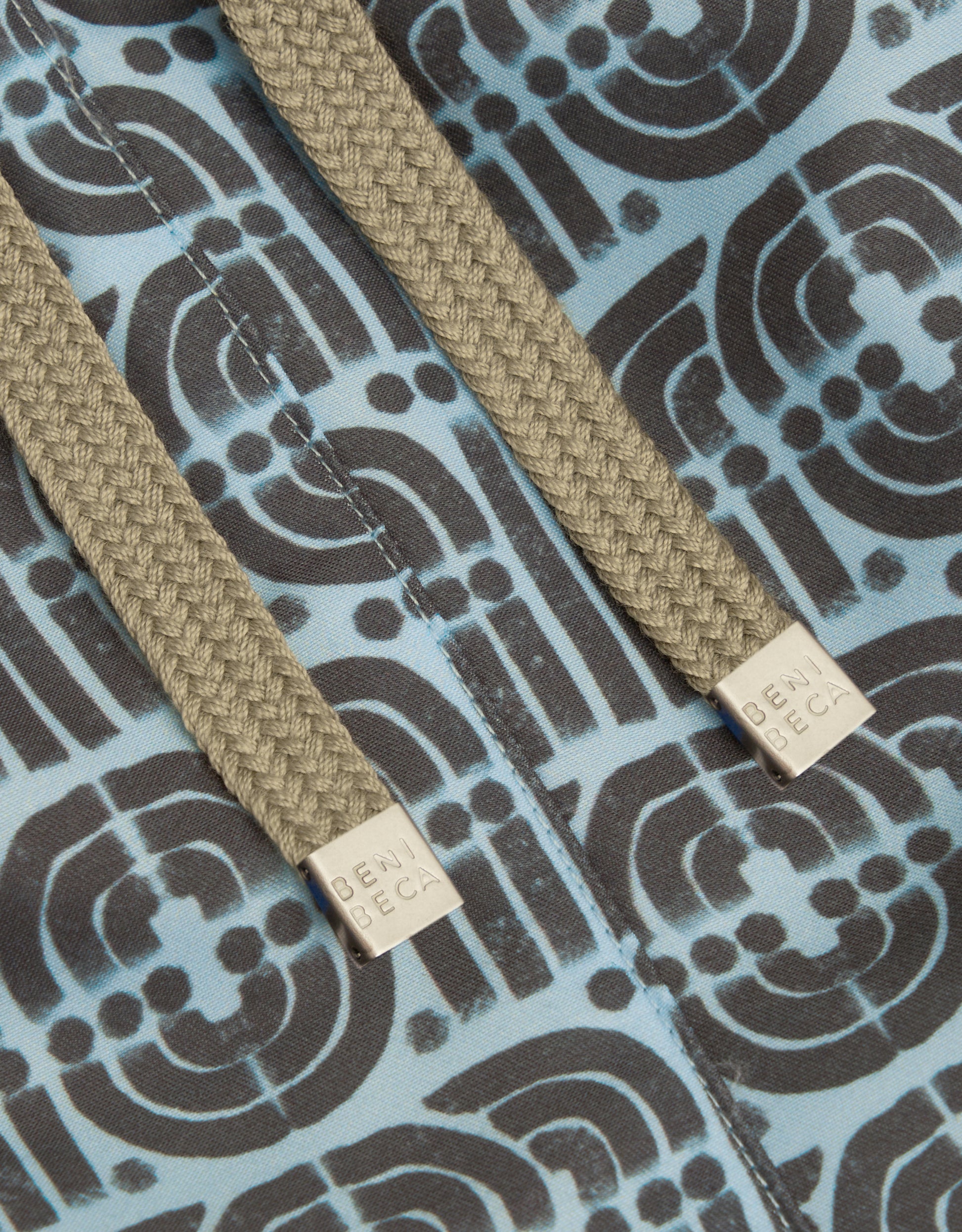 The classic mid-length short has become one of Benibeca's summer icons. It is the ultimate expression of relaxed luxury with a contemporary regular fit. The swim shorts are made from plastic rescued from the ocean and transformed into recycled polyester fibers. This sustainable and technological fabric is unique for its lightness, strength, quick drying time, and the softness of our "peach skin".